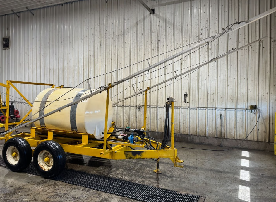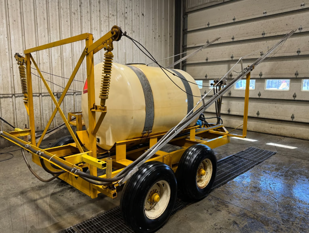500 gallon sprayer on a tandem axle with shop-built frame and booms. The hypro centrifugal pump is hydraulic driven and spray boom appears to have 3 electric controlled sections.