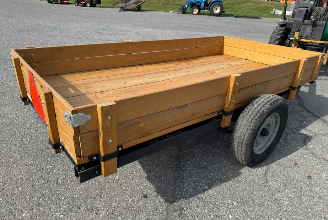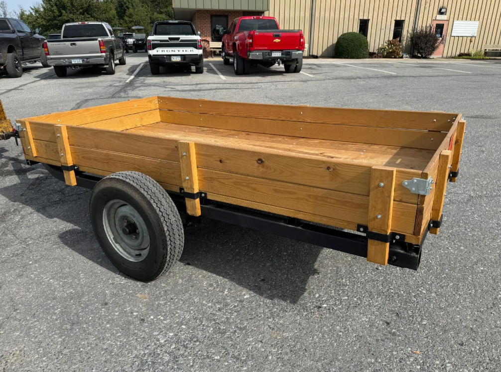 Condition Summary 5 x 10 trailer with clevis hitch, looks hand built, frame looks like mostly new steel or really well cleaned and painted. removeable sides. No title